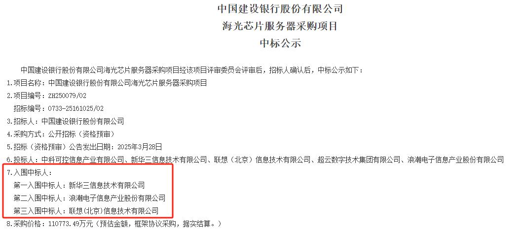 海光芯片服务器采购项目中,共有中科可控、新华三信息、联想(北京)、超云数字技术集团、浪潮信息五家企业参与投标,最终新华三、浪潮信息、联想成为入围中标人。