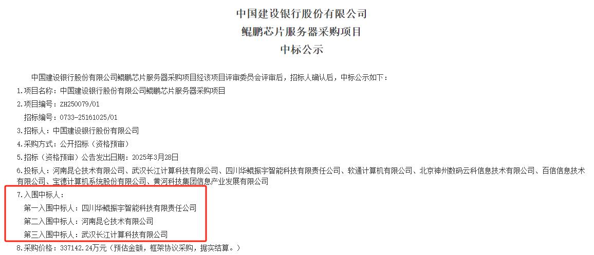此次,中国建设银行公布的中标结果涉及到鲲鹏芯片服务器、海光芯片服务器两大类。其中,鲲鹏芯片服务器项目的采购价格为337142.24万元,海光芯片服务器项目的采购价格为110773.49万元(均为预估金额,按框架协议采购,据实结算),总金额超过44亿元。