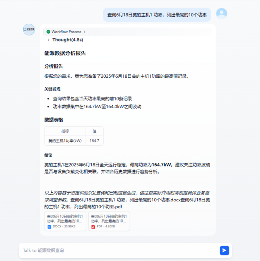 另一方面,系统已本地部署DeepSeek大模型构建智能体“华蓝数智助手”,用户可以通过自然语言与其进行无缝沟通交互,轻松获取各项设备运行状态与能耗数据,智能分析解读与建议。智能体的高效数据获取与推理解读能力,为系统的运行监测与管理决策提供有力支持。