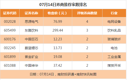 从券商推荐家数来看,7月14日有35家上市公司得到券商推荐,其中思源电气获得4家推荐,东鹏饮料获得3家推荐,中国巨石获得2家推荐。