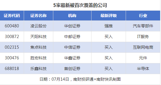 首次覆盖方面,7月14日券商共给出了5次首次覆盖,其中凌云股份获得华创证券给予“强推”评级,天阳科技获得中邮证券给予“买入”评级,焦点科技获得中信证券给予“买入”评级,胜宏科技获得华鑫证券给予“买入”评级,乐鑫科技获得首创证券给予“买入”评级。